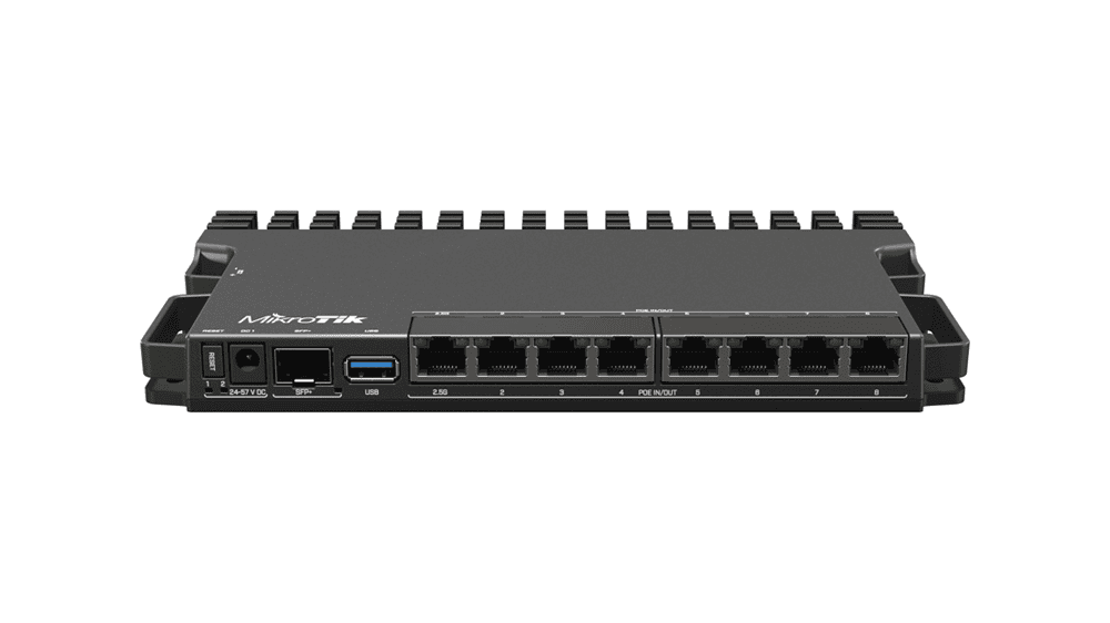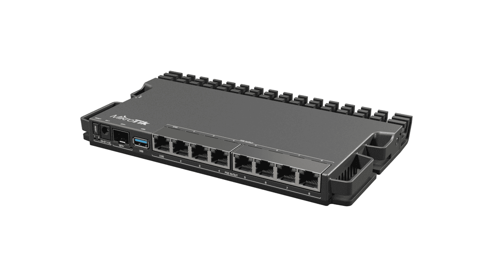 RB5009UPr+S+OUT არის მაღალი წარმადობის, IP66 compliant გარე როუტერი, რომელიც აერთიანებს 8 Ethernet პორტს (მათ შორის 1x 2.5G), 1x SFP+ 10G პორტს, PoE-in/out მხარდაჭერას ყველა Ethernet პორტზე და RouterOS-ის მოწინავე ფუნქციონალს. იდეალურია გარე Wi-Fi node-ების, CCTV კამერების და ოპტიკური uplink ინფრასტრუქტურისთვის.